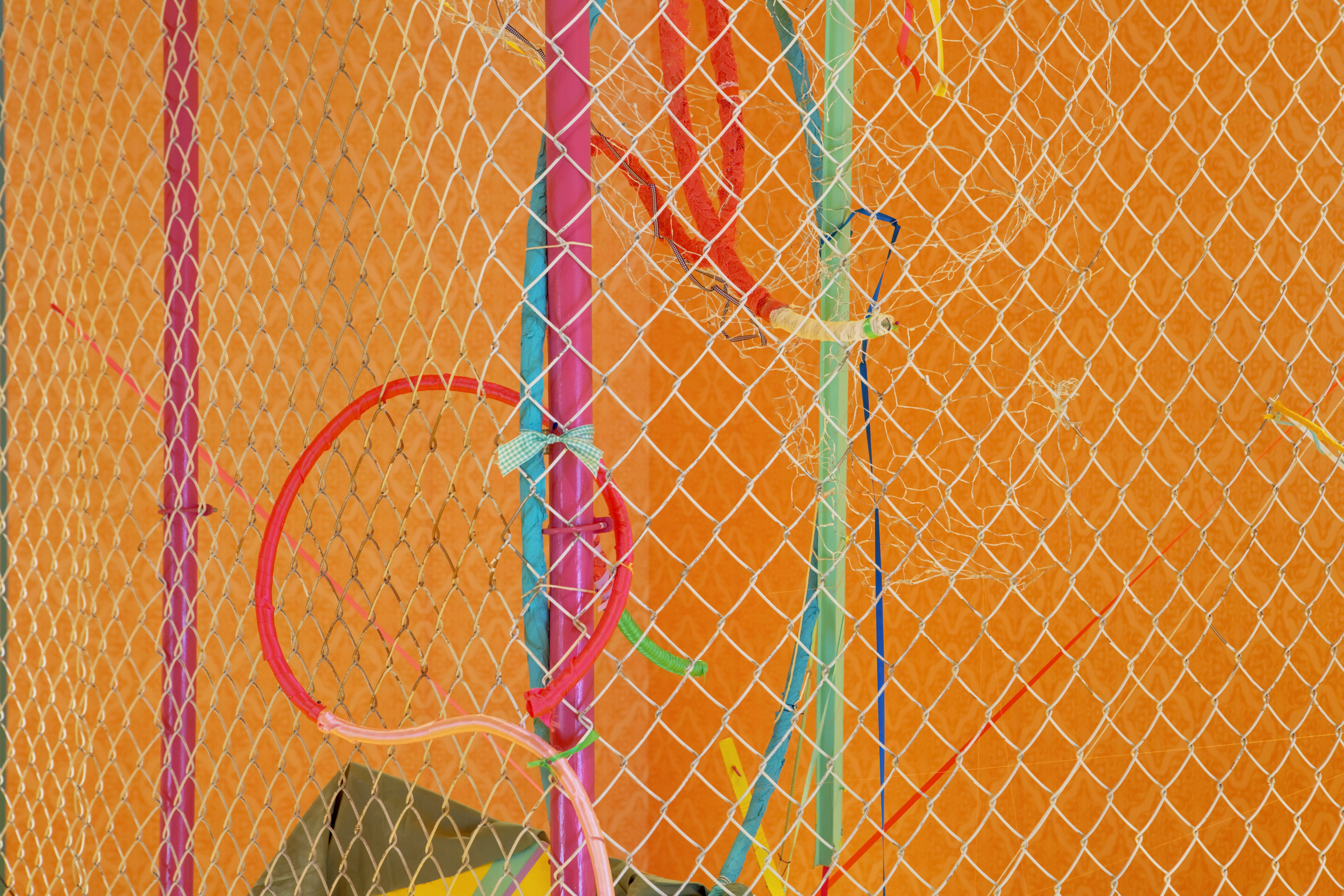 (wallpaper, paint, metal Poles, thread, wire, wood, paper, nails, needle, lace, leather, fluorescent light, cloth, fence, ribbon, book),